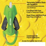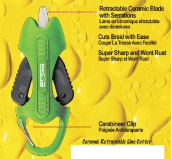 Retractable Ceramic Blade with Serrations that can cut braid with ease. Features super sharp blades and won't rust since they are ceramic. Use the Carabineer Clip so you don't lose them while fishing and to keep them handy!
