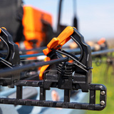 The ClickTrac Rail features a series of teeth on the top and bottom of the rail which give you the base to attach and adjust. Attach the ClickTrac Rail to the track adapter by depressing the orange button on the track mount and sliding the bottom of the ClickTrac Rail through the clamp. Once you remove pressure from the mount button, the rail will lock into place. Use this same process to adjust the overhang of the rail to achieve the desired positioning. The top half of the SideStage will be the same for all models and will come with three FlipGrips on each ClickTrac Rail. The FlipGrip slides along the top of the rail the same as the rail rides in your track mounted clamp. By depressing the orange FlipGrip release button, the cradle is free to slide up and down the ClickTrac Rail.