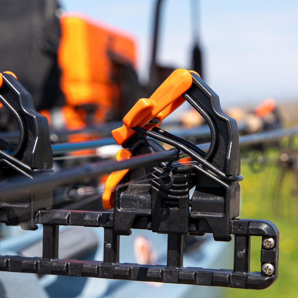 The SideStage is our take on a horizontal rod stager, but with all of the innovation and adjustability you would expect from YakAttack. This system is sold as a pair and comes with everything you need to stage and secure up to three rods. It introduces an all-new attachment system called ClickTrac. The ClickTrac Rail System allows you to easily attach, adjust and remove your accessories with the push of a button. For those who use a bow-mounted motor or pedal drive on their kayak off the side horizontal rod stagers like the SideStage could be a nice option to get three rods within reach and easy to access.