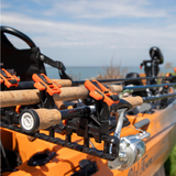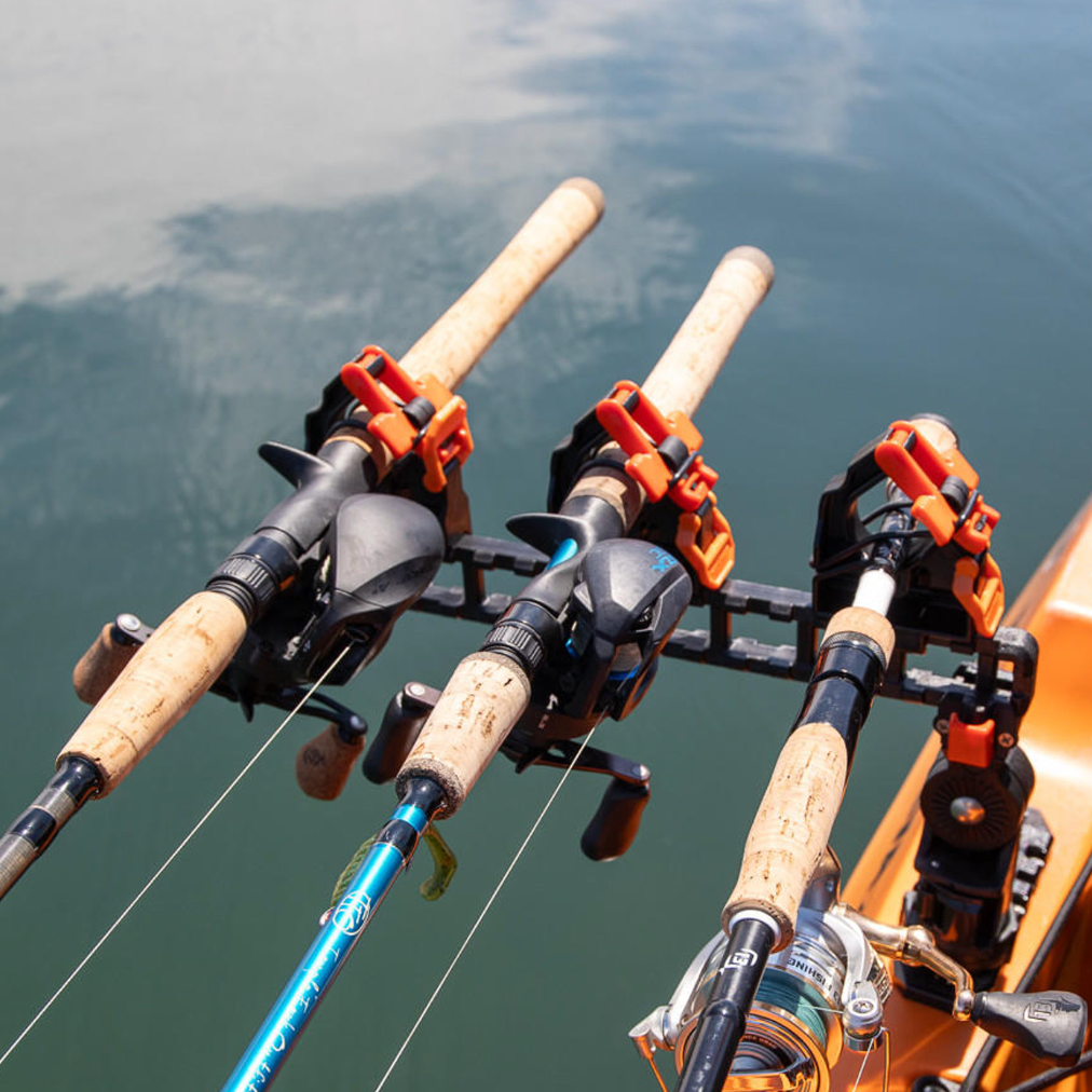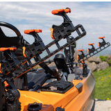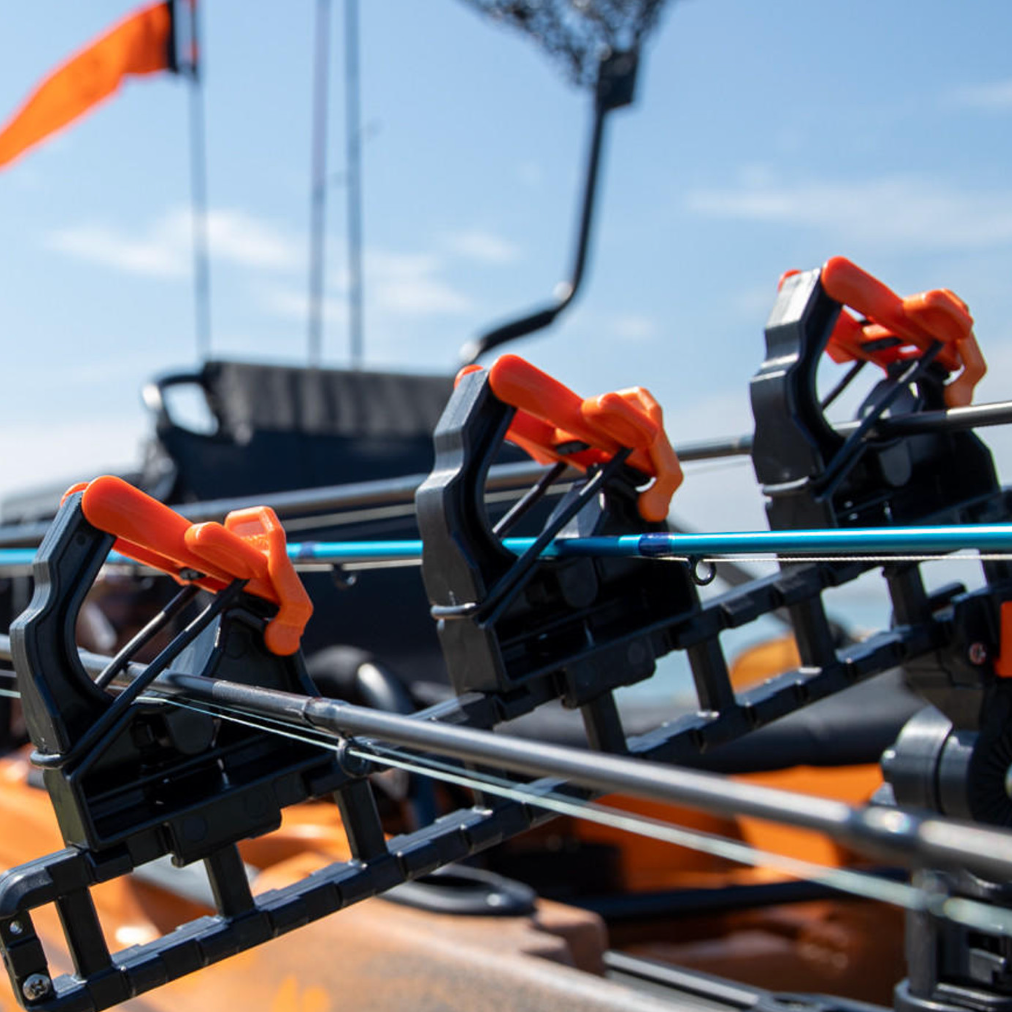 The SideStage Pro is our take on a horizontal rod stager, but with all of the innovation and adjustability you would expect from YakAttack. This system is sold as a pair and comes with everything you need to stage and secure up to three rods. It introduces an all-new attachment system called ClickTrac. The ClickTrac Rail System allows you to easily attach, adjust and remove your accessories with the push of a button. For those who use a bow-mounted motor or pedal drive on their kayak off the side horizontal rod stagers like the SideStage could be a nice option to get three rods within reach and easy to access.